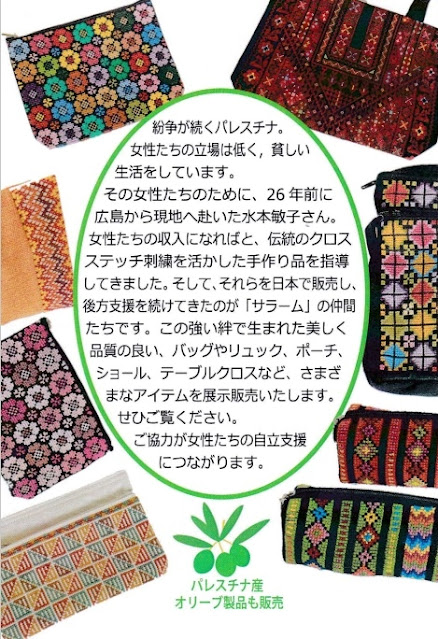 26年前に現地で活動を始めた水本敏子さんが、この度発行の「 Grande ひろしまVol.37 夏号」に掲載されます。今回のサラーム展示発売会では、パレスチナ刺繍を施したポーチやバッグ、ペンシルケース、その他オリーブ製品などを販売いたします。パレスチナの伝統刺繍はもちろん、サラームの長年に亘る地道な活動やパレスチナについて、多くの方々に知っていただける機会になればと願っております。